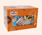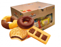 La boîte goûter mixte est composée de 4 gâteaux différents :15 doominos chocolat lait, 15 tronches de cakes, 15 doonuts marbrés et 15 doonuts nappés chocolat.